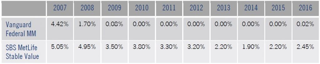 Stable value investments have been a core investment option in defined contribution retirement plans since the 1970s and are an attractive alternative to money market investments due to steady returns and principal preservation guarantees. Stable value funds have proven their worth to investors during the protracted period of low interest rates present since the recent financial crisis. Consider the following comparison of 2007-2016 calendar year total return for the Vanguard Federal Money Market Fund (VMFXX) to the SBS MetLife Stable Value Fund.