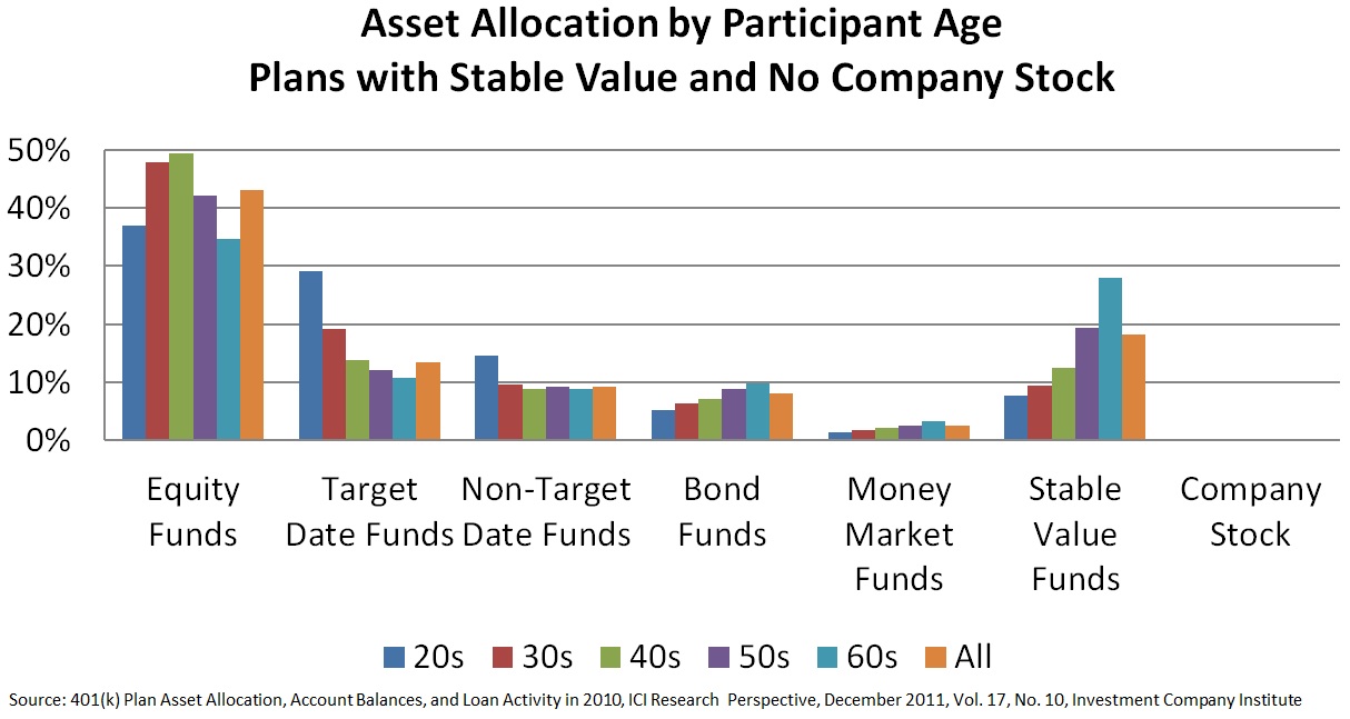 King observed that retirement plan participants in their 20s allocate about 8 percent of their assets to stable value, on average. Allocations increase as participants grow older, with those in their 60s holding about 28 percent to 29 percent of their assets in stable value.